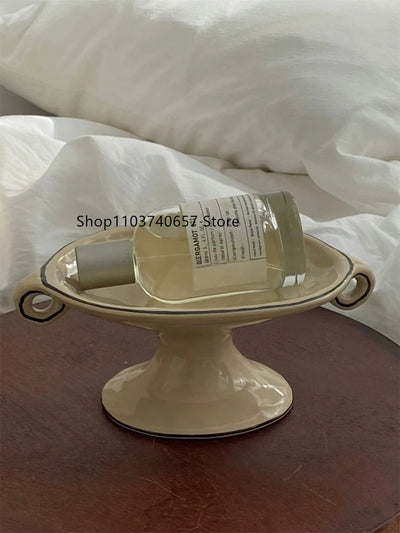 Vintage Simple Ceramic Storage Plate Cute Handmade Ornaments Home Accessories Creative Ins Style Binaural High Foot Tray