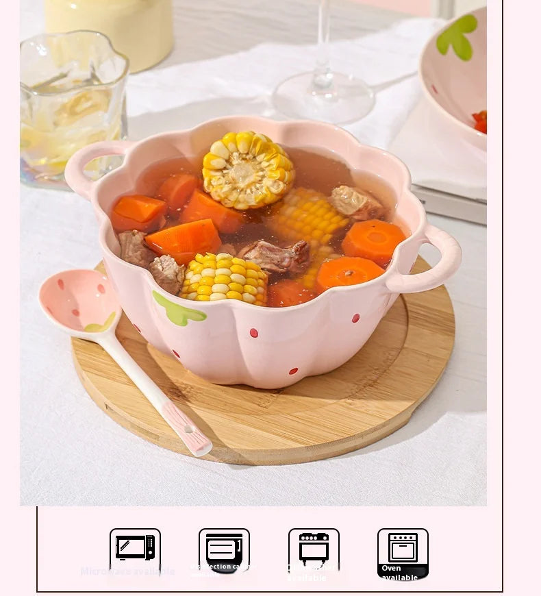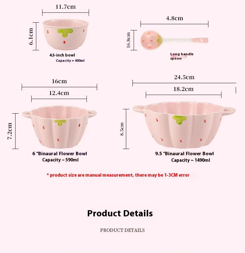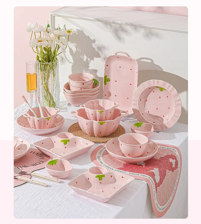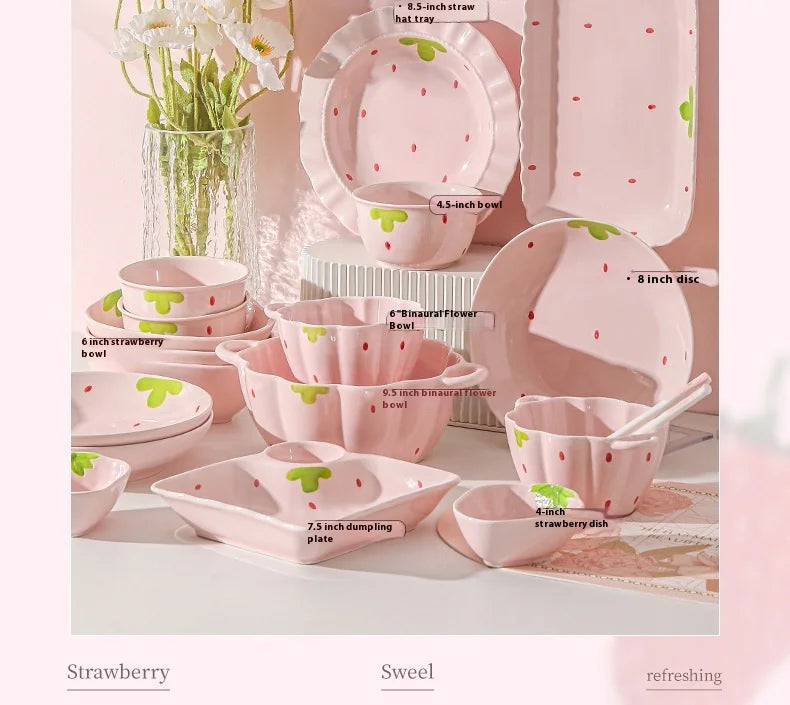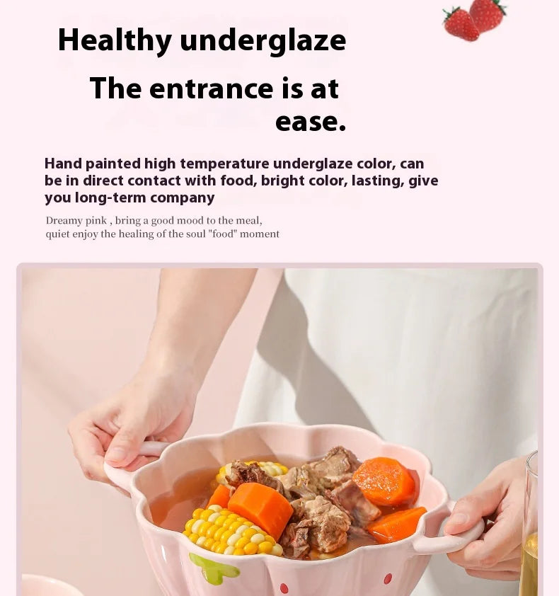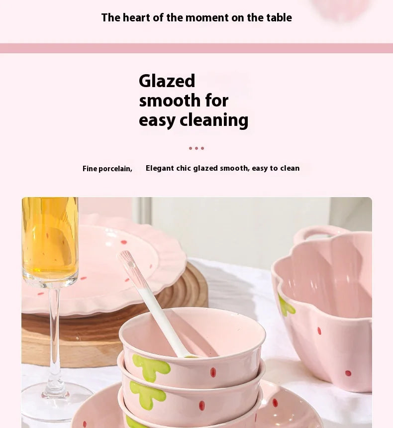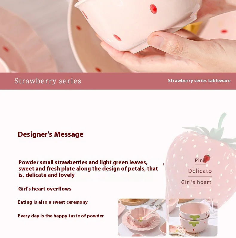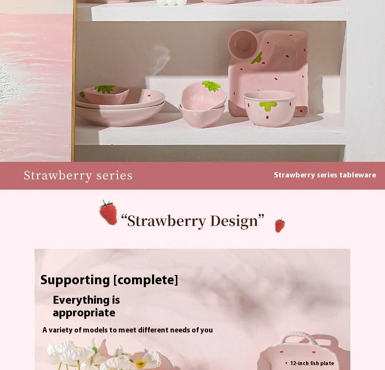 Cute Strawberry Ceramic Bowl Set For Home Use High Aesthetic Instant Noodles Salad Dessert Dining Tableware Kitchen Supplies