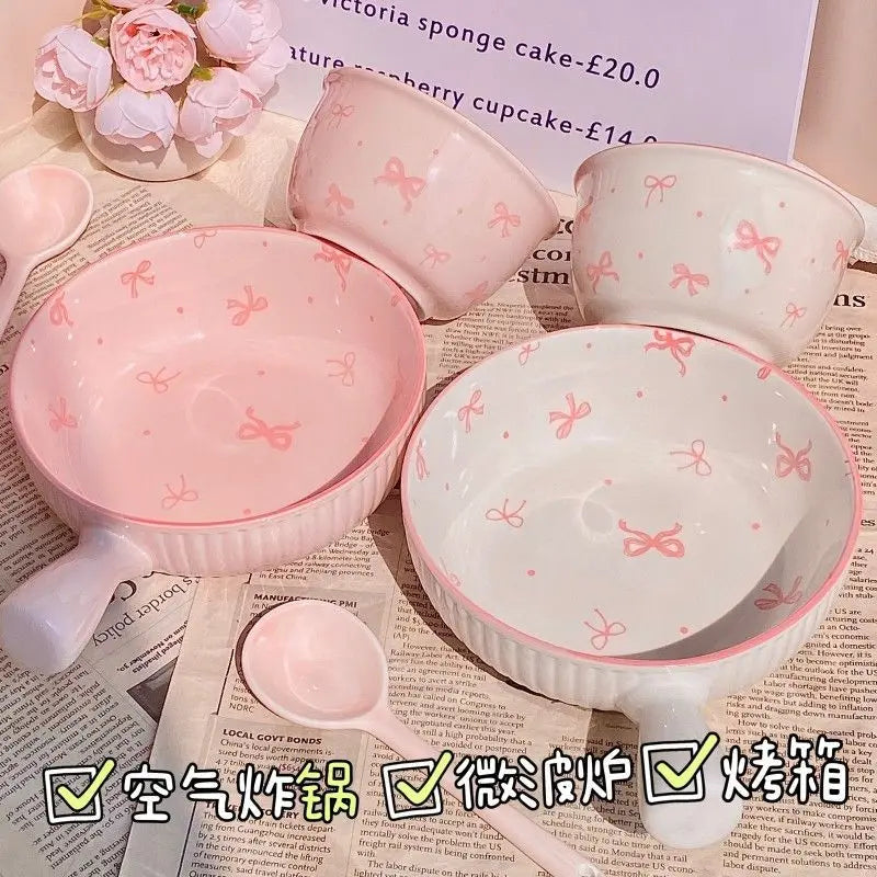 Pink Bow Ceramic Cutlery Set, Dessert Home Tableware Ceramic Handle Bowl Yogurt Cup High Value Breakfast Plate Drinkware