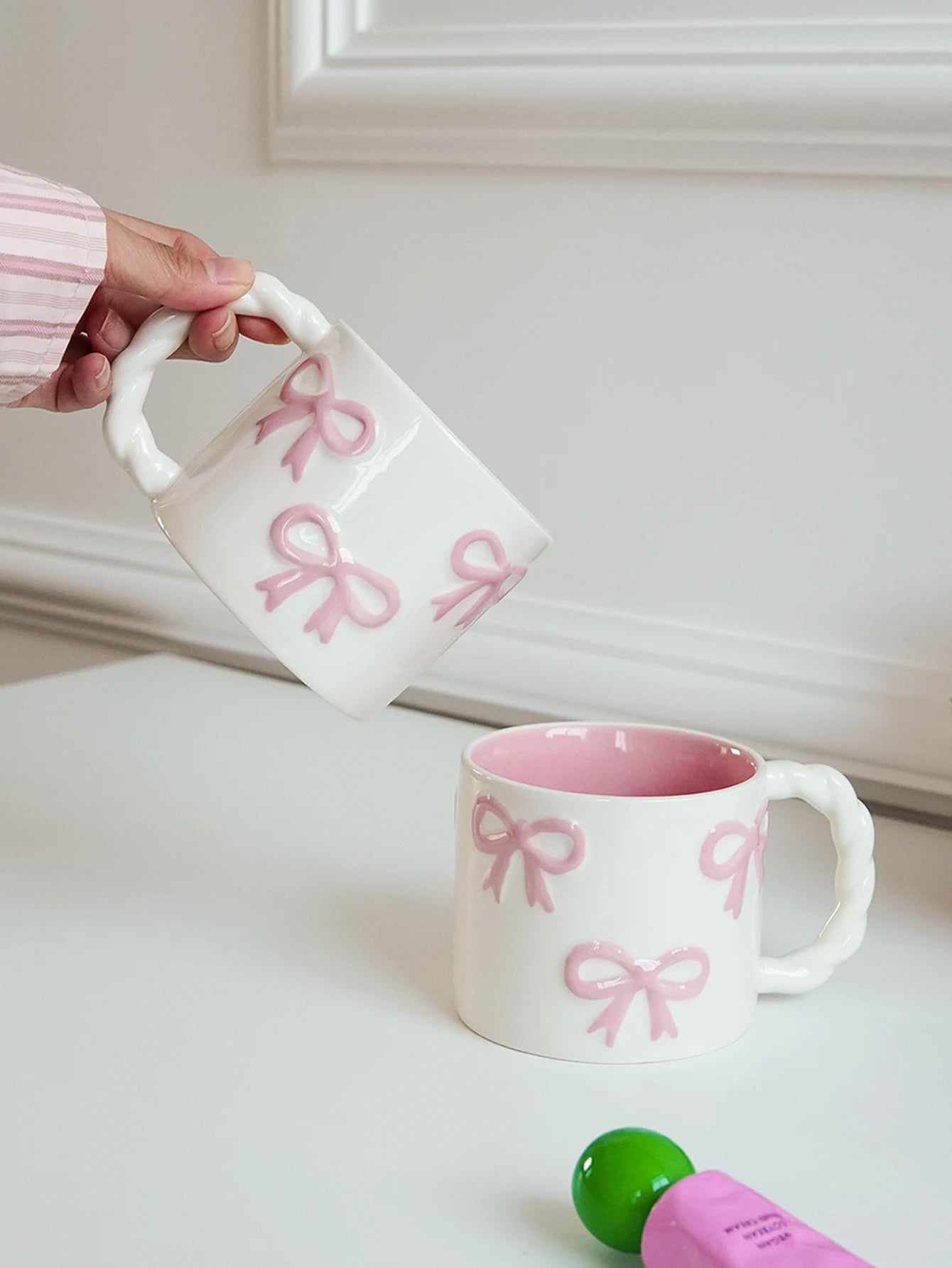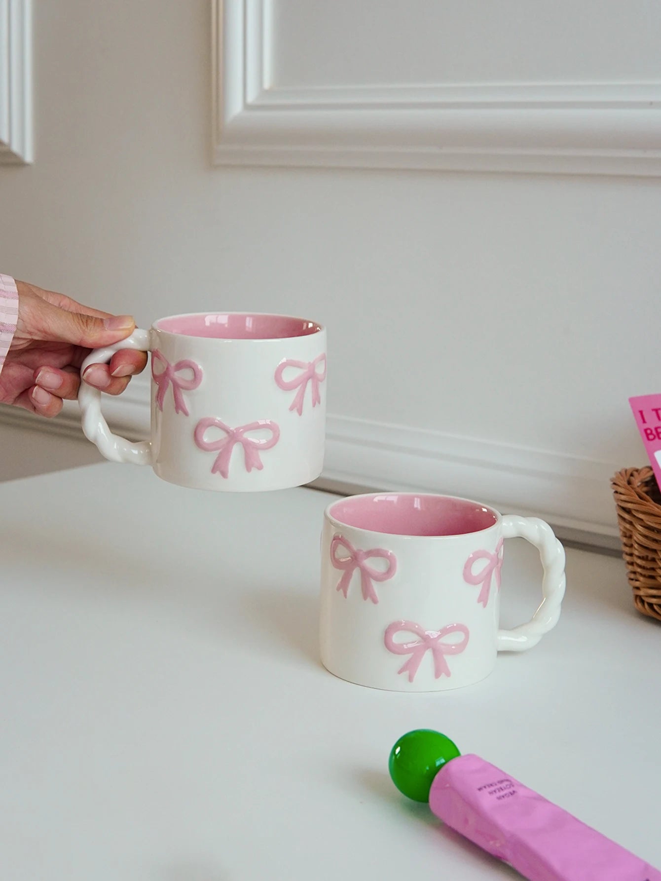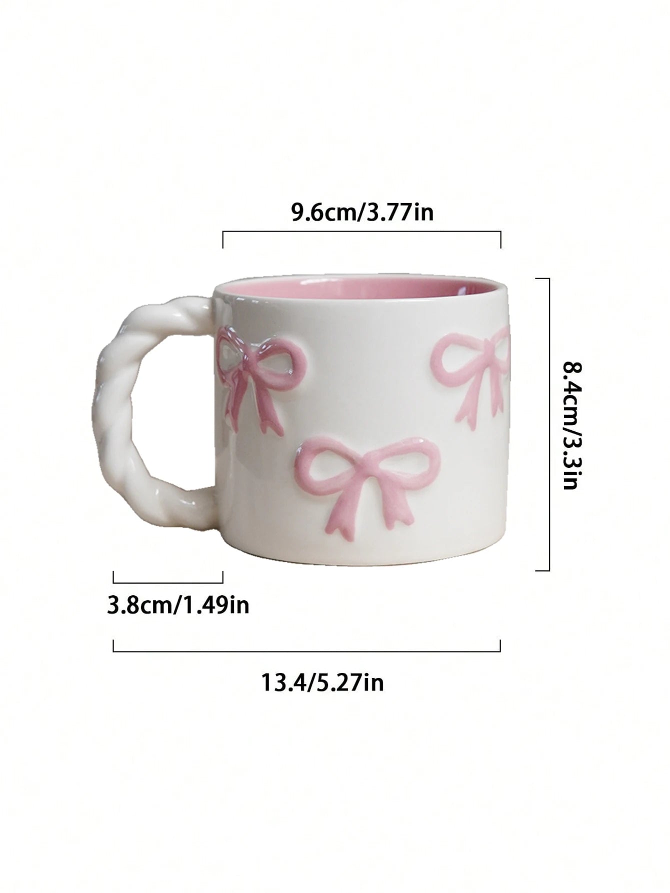 1Pc13.4Oz Pink Bow Ceramic Mug, Twist Handle Ceramic Mug, Exquisite and Simple Pink Embossed Mug, Suitable for Coffee Shop Latte Art Mug, Home Decoration Drinking Utensils, Kitchen Living Room Bedroom Drinking Cup, Gift Givin