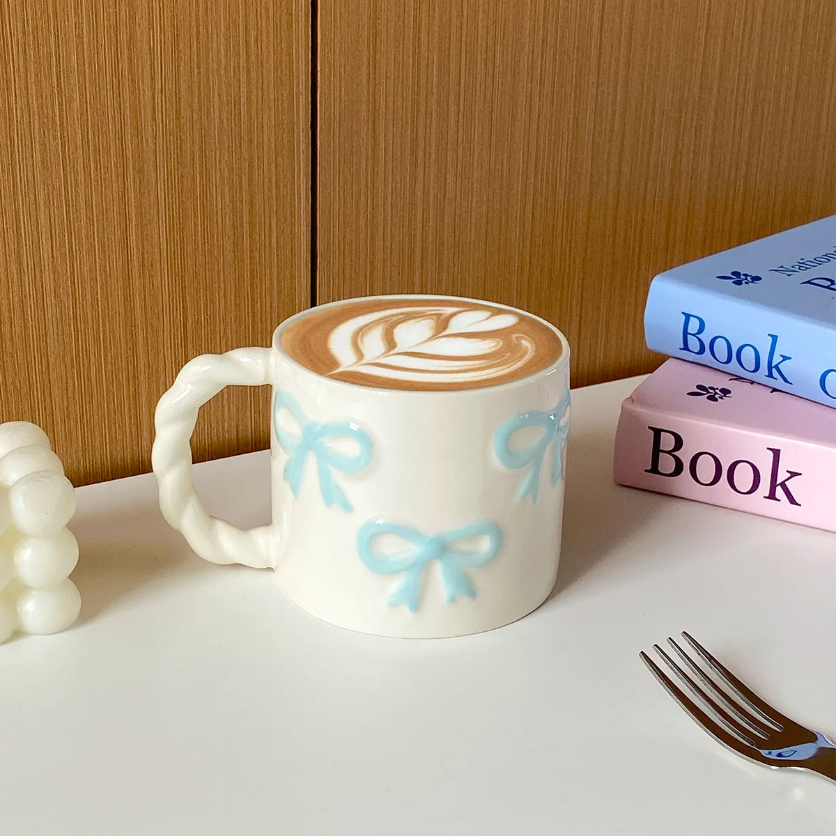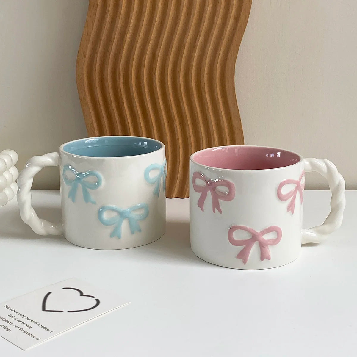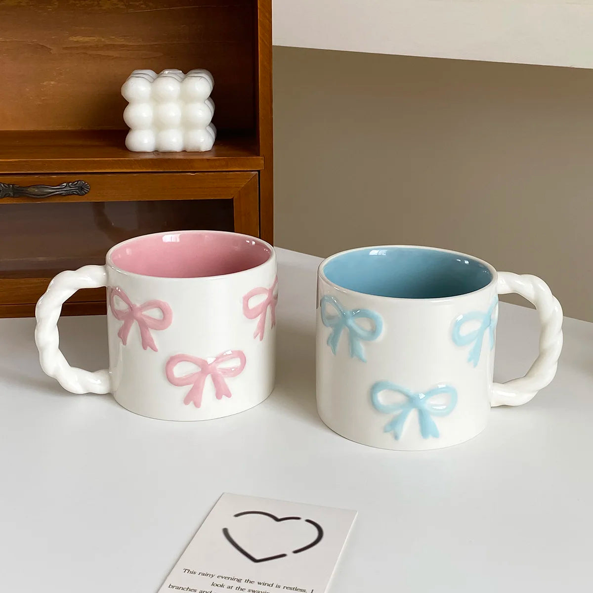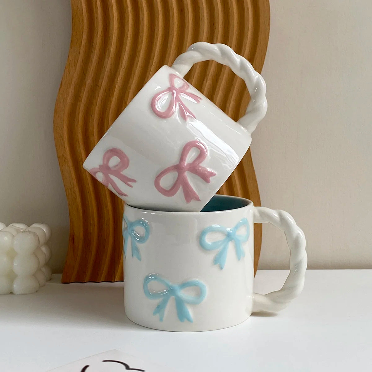 1Pc13.4Oz Pink Bow Ceramic Mug, Twist Handle Ceramic Mug, Exquisite and Simple Pink Embossed Mug, Suitable for Coffee Shop Latte Art Mug, Home Decoration Drinking Utensils, Kitchen Living Room Bedroom Drinking Cup, Gift Givin